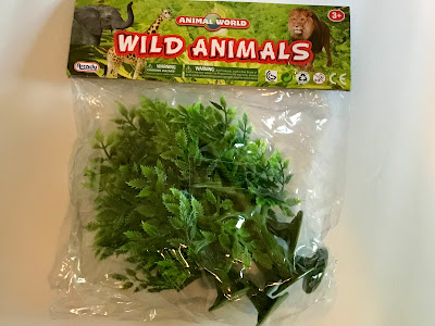 Made by Arcady, the bag header is labeled "Animal World" and "Wild Animals", with pictures of an elephant, giraffe, and a lion. Never mind that it's just a bag of trees.